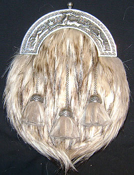 Brown dress sporran with a deer and hounds cantle (Pewter top) The sporran is made with lorica and faux fur and is availble with either crossed or straight tassels.